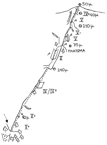 Η διαδρομή έγινε σε δύο κομμάτια. Τα πρώτα 350μ, μέχρι το πλάτωμα, έγιναν στις 27/8/2000 και το υπόλοιπο στις 17/6/2001. Ο συνολικός χρόνος που απαιτήθηκε ήταν 8ω. Προσοχή θέλει η πρώτη σχοινιά μετά το πλάτωμα, η οποία αρχικά κινείται ελαφρώς δεξιά (20μ) και μετά αριστερά για να ξαναβγεί στην κόψη.