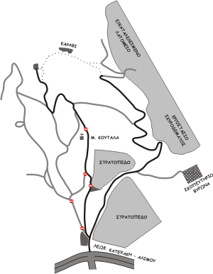 Για την πρόσβαση στο πεδίο από την Περιφερειακή Οδό Υμηττού, στρίβουμε στο φανάρι που βρίσκεται στο ύψος του Βύρωνα με κατεύθυνση προς το Στρατόπεδο Σακέτα. Μετά από 50μ υπάρχει μεγάλος χώρος στάθμευσης αριστερά, όπου μπορούμε αφήσουμε το αυτοκίνητο ή τη μηχανή και από εκεί να συνεχίσουμε με τα πόδια στο χωματόδρομο (25λ) που περνάει μέσα από το δημοτικό αθλητικό κέντρο. Μια άλλη λύση είναι να ακολουθήσουμε το αριστερό παρακλάδι του ασφαλτόδρομου, το οποίο μετά από 200μ φτάνει στην κεντρική πύλη του στρατοπέδου Σακέτα. Εκεί υπάρχει άλλος χώρος στάθμευσης, αν θέλουμε να συνεχίσουμε με τα πόδια (20λ), ακολουθώντας το χωματόδρομο αριστερά από την πύλη, ο οποίος περνάει από τη μονή Κουταλά. Στη μονή υπάρχει άλλος χώρος στάθμευσης, αναγκαστικός σε περίπτωση που η επόμενη μπάρα είναι κλειδωμένη, και από εκεί συνεχίζουμε με τα πόδια (15λ). Αν η μπάρα δεν είναι κλειδωμένη υπάρχει δυνατότητα να ανέβουμε αρκετά ψηλά, μειώνοντας αρκετά την πρόσβαση (5λ). Ένας εναλλακτικός δρόμος πρόσβασης, χρήσιμος όταν η μπάρα στο ύψος της μονής Κουταλά είναι κλειδωμένη, είναι ο δρόμος των παλιών μεταλλείων, ο οποίος ανεβαίνει ψηλά στο βουνό. Στην αρχική διακλάδωση, ακολουθούμε το δεξί παρακλάδι και, αφού περάσουμε έξω από δυο στρατόπεδα και ένα εργοτάξιο παρασκευής τσιμέντου, συναντάμε μια μπάρα η οποία συνήθως δεν είναι κλειδωμένη. Έχοντας διανύσει περίπου 4 Χμ, θα βρούμε μια μεγάλη φουρκέτα με χώρο για στάθμευση. Από εκεί υπάρχει σηματοδοτημένο, λίγο κακοτράχαλο μονοπάτι που οδηγεί στο Καράβι σε 5λ, αφού το πεδίο βρίσκεται στο ίδιο ύψος με τη φουρκέτα. Σε περίπτωση που αφήσουμε το αυτοκίνητο ή τη μηχανή στην άκρη του δρόμου, χρειάζεται ιδιαίτερη προσοχή κατά τους καλοκαιρινούς μήνες ώστε να μη πιάσουν φωτιά τα ξερά χόρτα από κάτω.