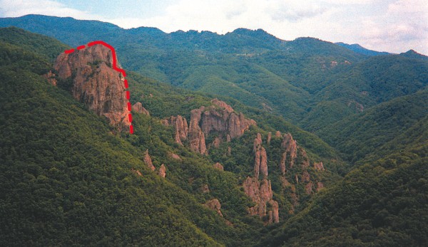 Ο Βράχος Των Ασκητών, όπως φαίνεται από το χωριό Πρασινάδα, με χαραγμένο το «Άγιο Πνεύμα» πάνω του.