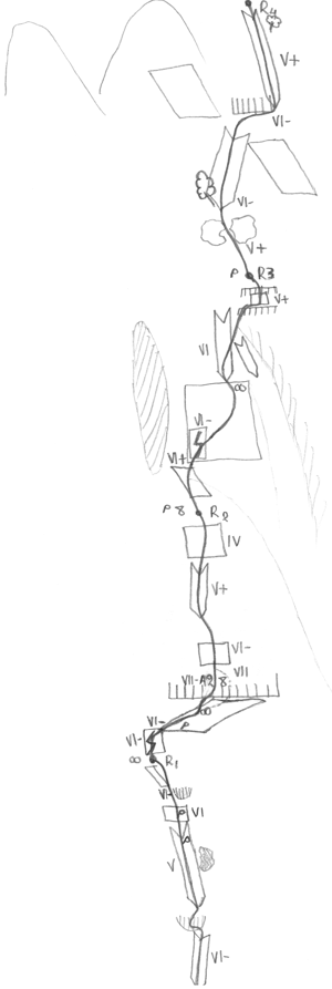 Για την 1η σχοινιά (35μ) ξεκινάμε σε διεδροσχισμή (VI-) που καταλήγει σε αρνητικό, το οποίο περνάμε από αριστερά (VI-) και συνεχίζουμε σε δίεδροσχισμή (V) μέχρι σπηλιά στο δεξιό τοίχο. Συνεχίζουμε διεδρικά (καρφί σε τρύπα) και στη συνέχεια φεύγουμε λίγο αριστερά σε πλάκα (VI) με τακάκια (καρφί κάτω από το μεγάλο αρνητικό μπλοκ). Περνάμε το μεγάλο αρνητικό μπλοκ (VI-) από αριστερά και βγαίνουμε σε μεγάλο πατάρι όπου κάνουμε ρελέ σε διαμπερή (κορδονέτο).