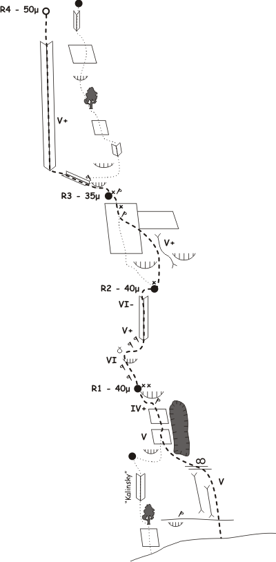 Η 1η σχοινιά (40μ) ξεκινάει από σχισμές δεξιά από την «Kalinsky», περνάει από πατάρι με διαμπερές, για να μπει στην 2η σχοινιά της διαδρομής αυτής και, αφού περάσει από ένα καρφί, να καταλήξει στο 2ο ρελέ της.