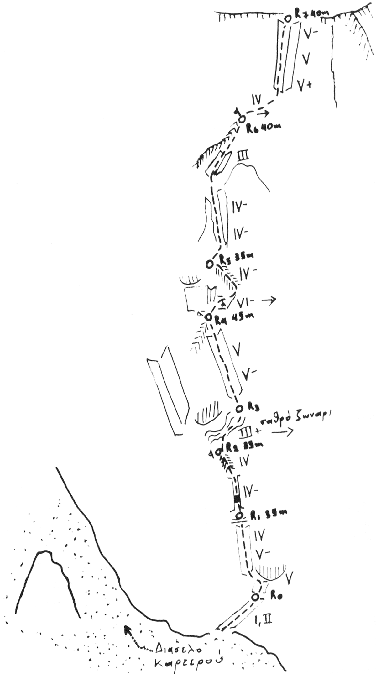 Η γραμμή ξεκινά μέσα από το λούκι του Καρτερού και ακολουθεί την ανατολική κόψη, δίνοντας μια σχετικά γερή και ευχάριστη διαδρομή.
