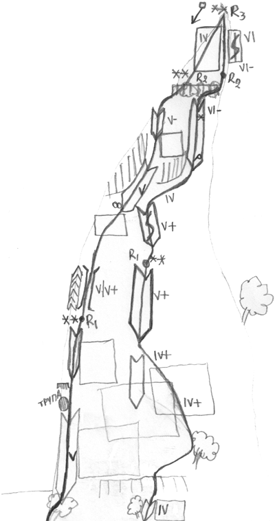 Στην 1η σχοινιά (V+, 35μ) ξεκινάμε δεξιά από μικρό δέντρο σε δίεδρο (IV) και συνεχίζουμε σε πατάρι με φυτά και χώματα. Πάμε προς τα δεξιά σε δέντρο και από εκεί φεύγουμε πάνω και αριστερά σε πλάκα (IV+) με τακάκια μέχρι τη βάση χαρακτηριστικού δίεδρου. Σκαρφαλώνουμε το δίεδρο (V+) και κάνουμε ρελέ (2 πλακέτες με κρίκους). Εναλλακτικά, μπορούμε να μπούμε στο δίεδρο σκαρφαλώνοντας ευθεία από κάτω του σε πλάκα με τακάκια (V+, 7μ, πλακέτα) (αποφεύγοντας την αριστερή τραβέρσα) και συνεχίζοντας σε μικρή σχισμή που ασφαλίζεται καλά.