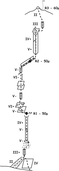 Η 1η σχοινιά ξεκινά από χορταριασμένη ράμπα (II) που οδηγεί στην βάση εύκολου δίεδρου. Εναλλακτικά, μπορεί να ξεκινήσει από πλάκα (IV) που βρίσκεται δεξιά από την ράμπα και οδηγεί επίσης στην βάση του ίδιου δίεδρου. Το δίεδρο ανεβαίνει σε χορταριασμένο επικλινές πατάρι, από όπου αρχίζει μια καμινάδα. Σε δυο σημεία, ένα στην αρχή της καμινάδας και ένα περίπου στη μέση της, υπάρχουν σφηνωμένες πέτρες που δυσκολεύουν λίγο το σκαρφάλωμα. Στην έξοδο της καμινάδας, γίνεται το ρελέ σε 2 καρφιά.