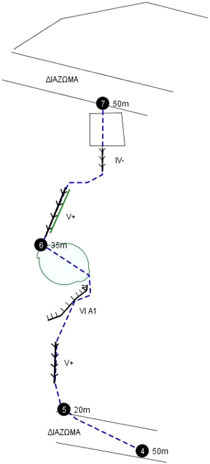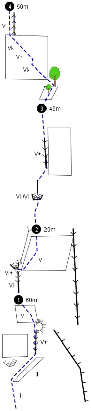 Η 2η σχοινιά (20μ) μπαίνει στο διεδροσεμινέ που βρίσκεται ακριβώς από πάνω (VI-) το οποίο και σκαρφαλώνει όλο μέχρι την έξοδό του (VI+) δεξιά σε πλάκα με τακάκια όπου και γίνεται το ρελέ σε προσωρινές ασφάλειες.