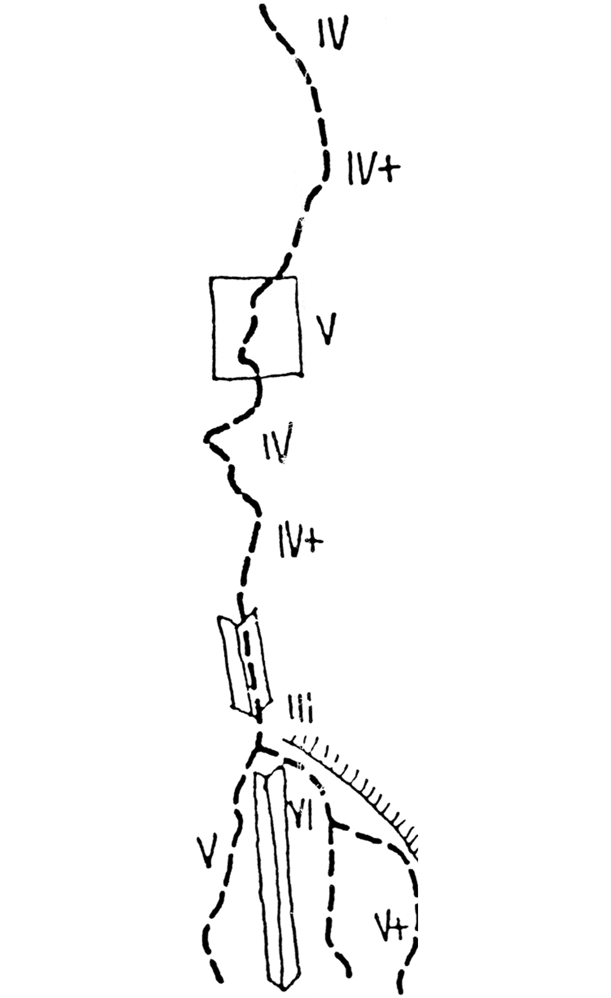 Στην 6η σχοινιά (IV, 30μ) φεύγουμε εύκολα σε σπασμένα με μόνο ένα πέρασμα (IV), ενώ η υπόλοιπη σχοινιά κινείται σε εύκολο πεδίο (ΙΙΙ), μέχρι χαρακτηριστικό άνετο δέντρο, κατάλληλο για ρελέ.