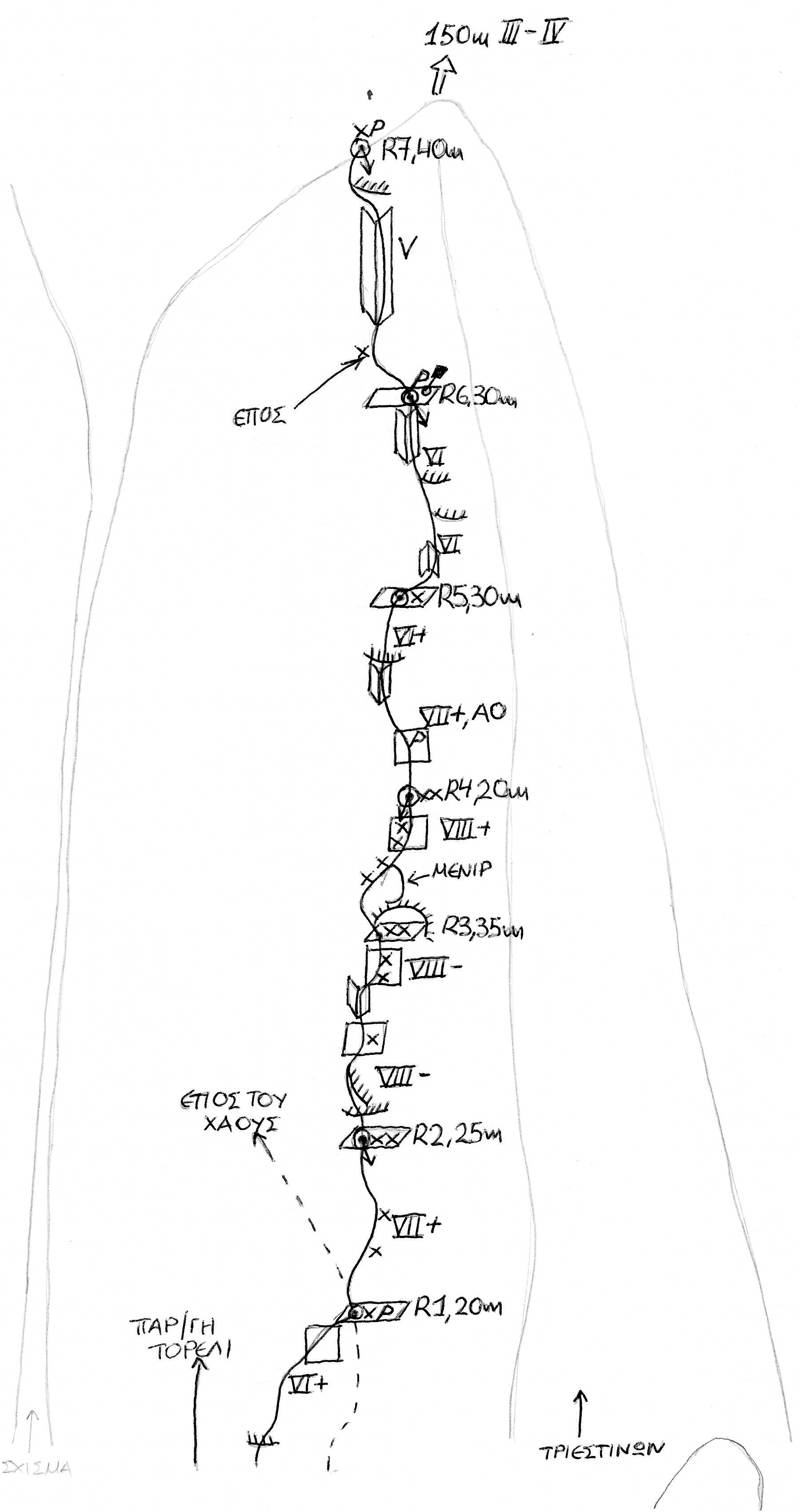 Η διαδρομή ξεκινά λίγα μέτρα αριστερά από το «Έπος του χάους» (όπου υπάρχει σφηνωμένος ιμάντας) και την συναντά στο R1. Από κει και πάνω η γραμμή κινείται στα δεξιά της «Έπος του χάους» και την συναντά πάλι στο R6. Η επόμενη σχοινιά είναι κοινή με το «Έπος του χάους», μέχρι να συναντήσει την «Κόψη των Τριεστίνων» στο R7. Μετά συνεχίζει ακολουθώντας την «Κόψη των Τριεστίνων» μέχρι την έξοδό της.
