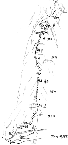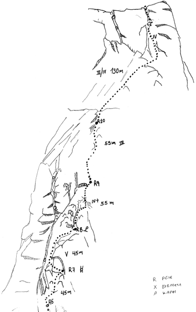 Η είσοδος στη διαδρομή γίνεται από αριστερά, αποφεύγοντας τις μεγάλες και σαθρές στέγες, με μια σχοινιά που είναι σχεδόν ολόκληρη τεχνητή (A1), σε καλής ποιότητας γενικά βράχο, αλλά μπορεί μάλλον να γίνει και ελεύθερα αν εξοπλιστεί καλύτερα με βύσματα 10mm, αφού για την κατά το άνοιγμα χρησιμοποιήθηκαν βύσματα 6mm. Οι σχοινιές από την 3η έως και την 5η κινούνται σε μεγάλο δίεδρο και ταυτίζονται με την «Μιχαηλίδη - Ξανθόπουλου», αν και δεν βρέθηκε κάποιο σημάδι (καρφιά, ιμάντες) που να δείχνει ότι κάποιοι έχουν περάσει από εκεί. Αυτές οι τρεις σχοινιές είναι οι ομορφότερες της διαδρομής, σε συμπαγή βράχο και ασφαλίζονται εύκολα με καρύδια και friends. Από την 6η σχοινιά και μετά, φεύγοντας προς τα δεξιά, ακολουθήθηκε ο ευκολότερος δρόμος, όπου συνεχόμενες σχοινιές μικρής δυσκολίας, με λίγα σαθρά, οδηγούν στο ανώτερο τμήμα της πλαγιάς και από εκεί στην έξοδο, 50μ αριστερά από το τριγωνομετρικό σημείο.