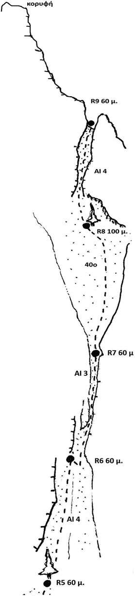 Η 1η, 3η, 6η και 9η σχοινιά είναι οι πιο ενδιαφέρουσες. Η 1η ασφαλίζεται μέτρια και οι υπόλοιπες ικανοποιητικά.
