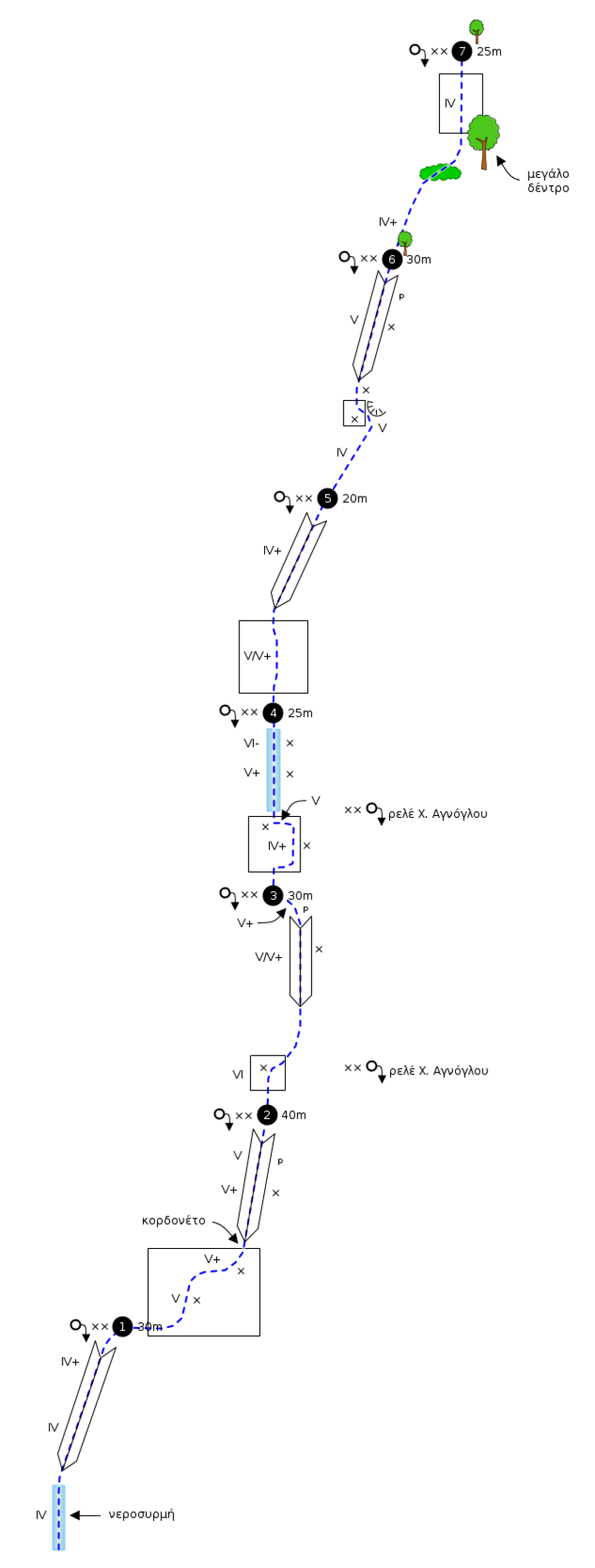 The 7th pitch (25m) goes behind the tree and easily (IV-) leads to a ledge, next to a big tree, where the belay is found; this same belay is used for the neighbouring “Hellenomania” as well.
