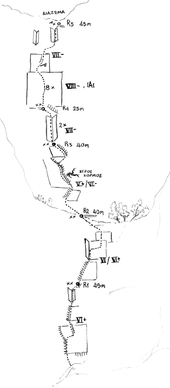 The first ascent of the route “Aposynthesi” (VIII-, 195m) was realized on 22/9/2009 by G. Torelli - N. Karympalis.