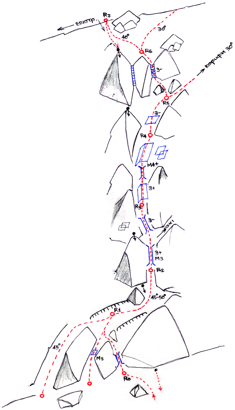 The first winter climb of “Blotti” (III 3+ M4+) was realized on 7/2/2004 by G. Katsavos - C. Giokas and the second one on 8/2/2004 by C. Belogiannis - A. Karapetakos - E. Karageorgi. The line was ascended after the high temperatures that followed a strong snowfall and so the conditions were great. Actually, the wedged rock at the second pitch (rock climbing rating VI-) was covered by frozen snow (3+ M3) and the dihedral of the route was filled with frozen snow and ice.