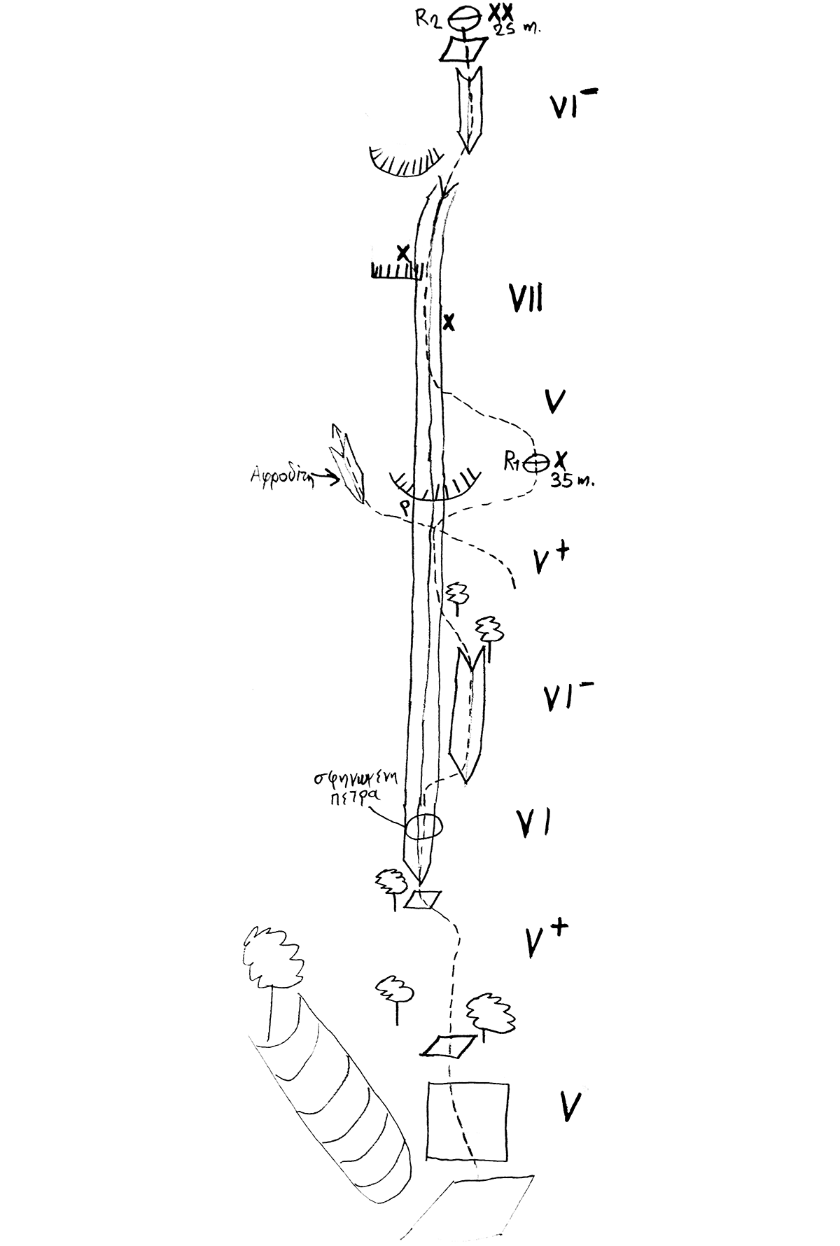 The approach to the route is from the classic path of Zilnia and lasts 35min. After the intersection with “Gounaridi - Georgiadi” (or “Classic”), we continue a little further on the regular path and a few meters after we start a steep climb, it has a fork with a pile of stones in the middle. From there we go left and follow the piles of stones, until we reach the bottom of the route. The route starts from a small ledge, where on the left we see a small ditch with trees.