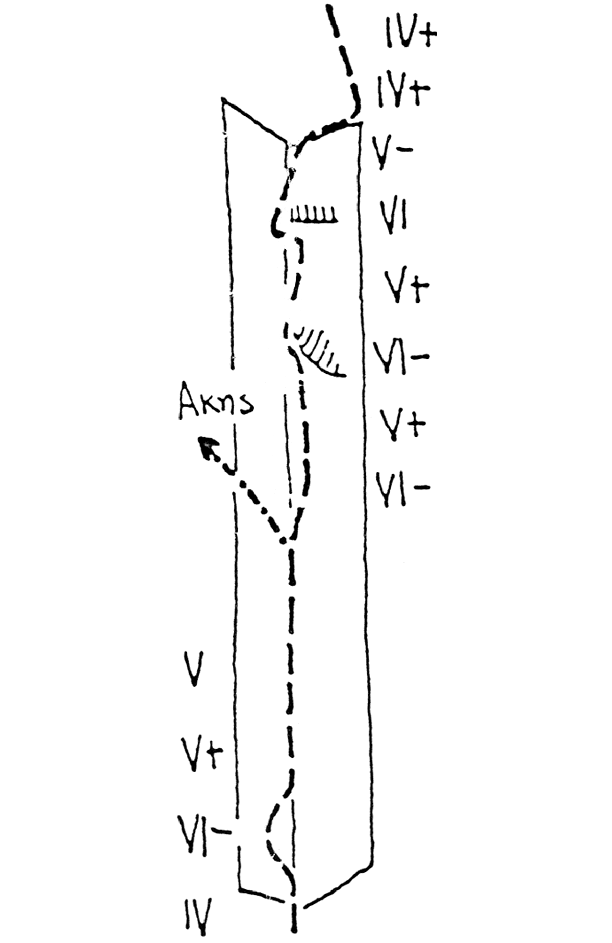 The 1st pitch (40m) starts on easy rock to enter a dihedral (IV+), which follows up to a small slab with a negative, which is passed either from the dihedral on the right (VI-, original version), or from the left with a small traverse (V+, variant), to continue on a dihedral (V) to the belay (2 bolts with rings).