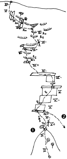 The 1st pitch of the route leads, through easy climbing fields (III), to a ledge, where there is a little tree. The 2nd pitch goes on straight up and then a bit diagonally to the left and so leads to the belay, set on a small ledge. The 3rd pitch moves slantways to the right on a slab, up to the characteristic horizontal ledge of the face. The 4th pitch begins with a passage (VI-) and right after follows a big left traverse, and then the pitch continues straight up, moving on an easy dihedral. Right after this dihedral follows an easy traverse to the left (3m), which leads to the belay, just behind the ridge. The 5th pitch requires self-control, because after the passage on top of the belay (VII-) which is protected, follows a run-out up to a narrow ledge and from there a traverse to the right leads to the belay. The 6th pitch is equipped with pros but it does require strength because it moves on overhanging wall. The 7th pitch, which is the shortest and easiest one according to its rating, leads to a woody ledge on the peak, where the belay is set on a tree to the right.