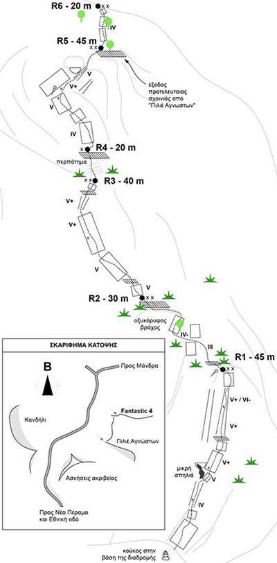The first ascent of the route “Fantastic 4” (V+, 200m) was realized on 8/10/2017 by G. Apostolou - D. Sfantos - M. Sourlatzi - E. Angelopoulos.