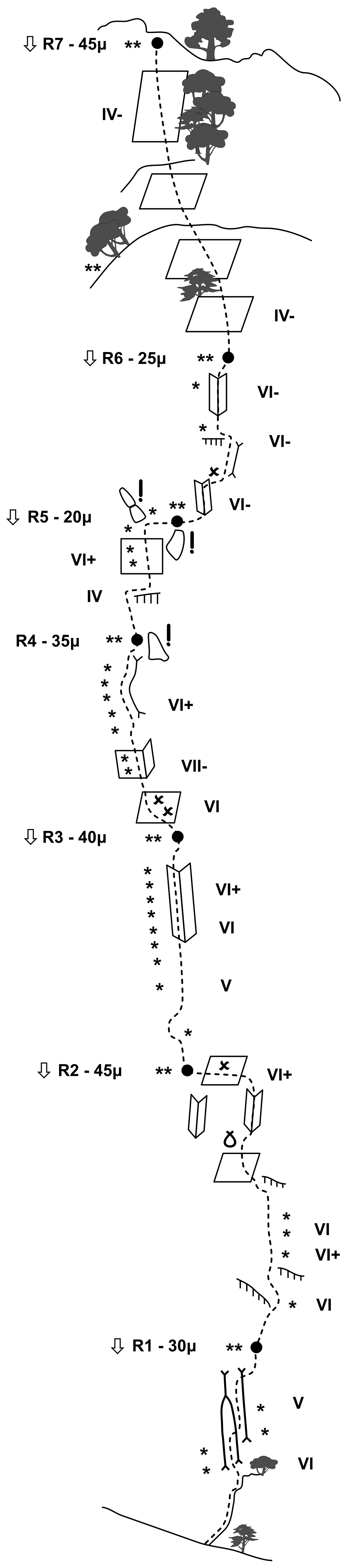 All belays are equipped with double rings, placed on one 12mm bolt and one 10mm bolt and they are all suitable for escape or return abseiling. Return abseiling, using 50m ropes, is possible from R7, R6, R5, R3, R2 and R1 (6 abseils). Alternatively, it is possible to return by abseiling from the routes “Africana” and “Christoforos Agnoglou”, using the last belay of “Africana” that is placed under the tree, on the left end of the ledge which we meet in the middle of the 7th pitch. In order to get from R7 down to that point, a 20m abseil is required. Moreover, an easy right traverse (4m) will take you from R7 to the big ledge, from where the marked footpath leads down to the abseil of “Tower” or straight (eastwards) to the climbing footpath that leads down to the easy climbing field.