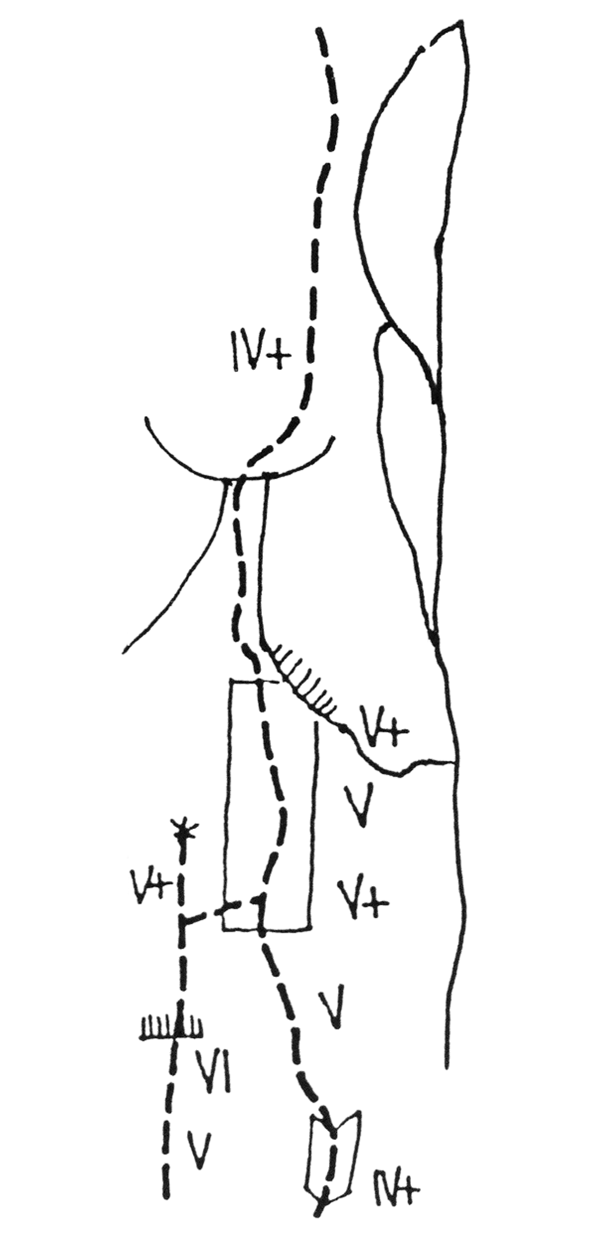 Confusion is also caused by its length. A. Theodoropoulos, after the 2nd belay, draws the line to go diagonally right and up, so as to exit to the ledge, giving a total length of 160m. G. Aligiannis draws it to consist of only the first two pitches, with a total length of 80m.