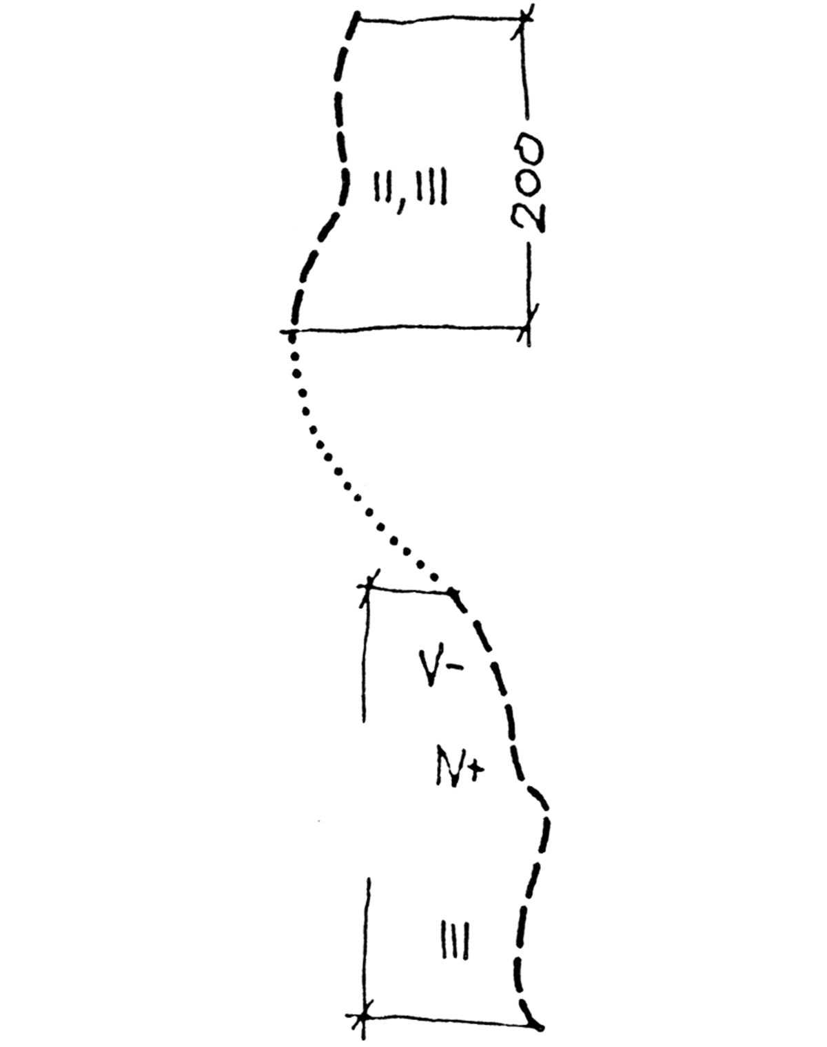 The route initially follows the left side of the large ridge (V-) which is the beginning of the uphill entrance to the huge notch in the crag, going parallel to the later “Avramopoulos - Kladis”. The ridge leads to the large ledge of the crag and from there on its course is not exactly known, but it is thought to traverse left and up the ledge and then right and up, following the easiest path (up to III) to the summit ridge.