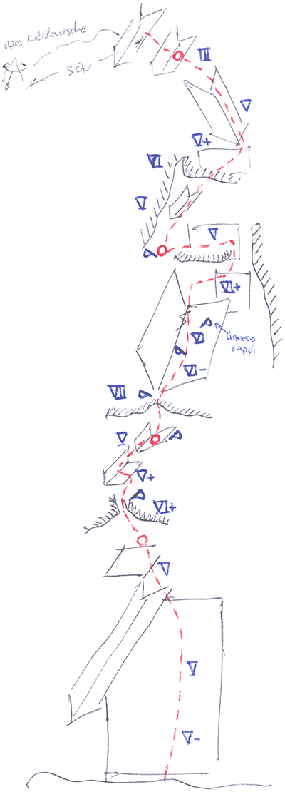 The return after reaching the top is by walking on the ledge to the right and descending from the climbing path. Alternatively, it can be done by rappelling from the route “Tower” or from the “Kalidonische pfeiler”, but this option is much more time-consuming than the climbing path.