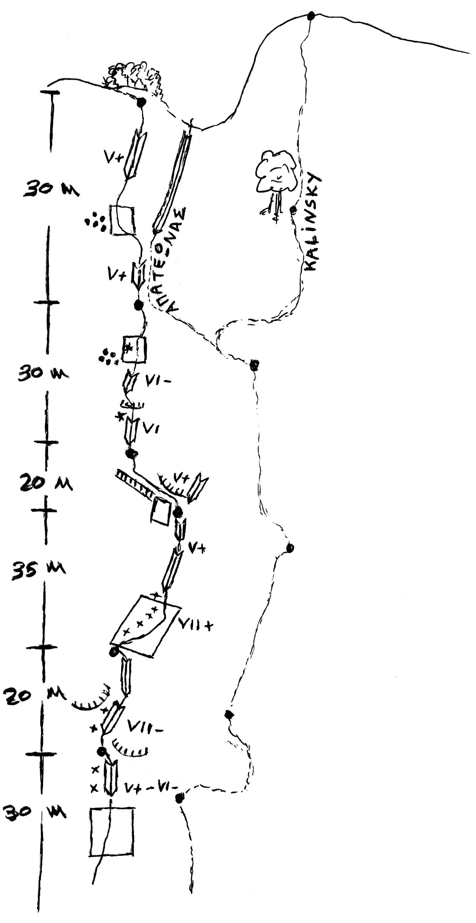 The 1st pitch (VI-, 30m) starts with a positive slab, continues to a crack-dihedral protected with two bolds and from there goes to the belay (2 bolds).