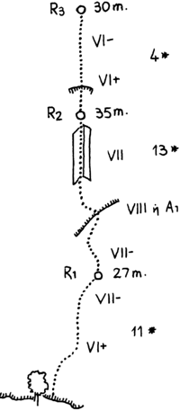 The first ascent of the route “To pnevma tou Comici” (VIII (VII A1), 90m) was realized on 4/6/2001 by J. Titt - I. Zaczek - A. Theodoropoulos.