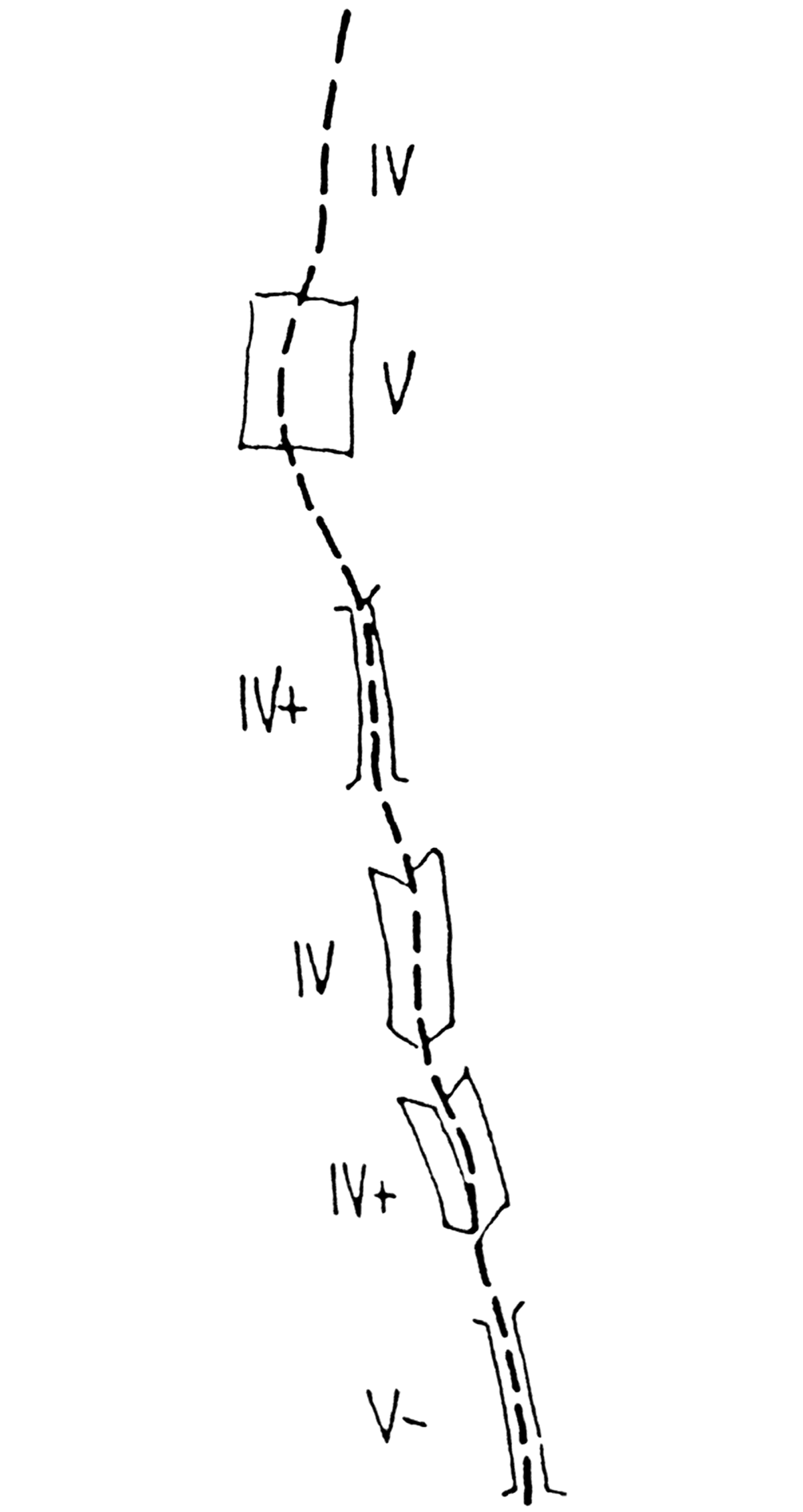 The route consists of 5 pitches, with the 4th (V+) being the most difficult, which starts from the top of the pillar and follows a vertical slab.