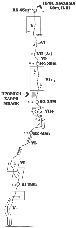 The first repetition of this ascent was realized on 3/11/2006 by G. Torelli - N. Karympalis, who free climbed the A1 of the 5th pitch and rated it at VII-.