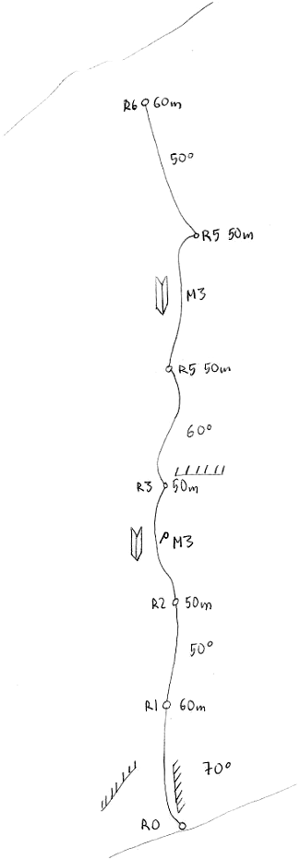 Η γραμμή, που σκαρφαλώθηκε στα πλαίσια της σχολής εκπαιδευτών ορειβασίας, ξεκινά στο πρώτο λούκι που συναντά κανείς όταν προσεγγίζει την ορθοπλαγιά από ανατολικά (από Μετερίζια).