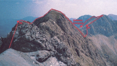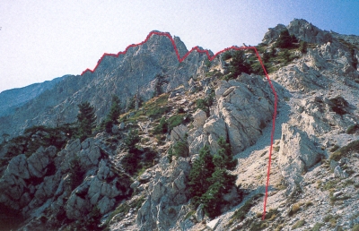Το πρώτο τμήμα της κορυφογραμμής ξεκινά από το Διάσελο του κυνηγού και φτάνει μέχρι την κορυφή Γαρδίκι. Όλο το τμήμα αυτό είναι ορατό εξ αρχής και αποτελείται από διαδοχικούς μικρούς πύργους που ενώνονται μεταξύ τους με διάσελα. Ουσιαστικά έχουμε να κάνουμε με ένα συνεχές ανεβοκατέβασμα πάνω στην κόψη. Η τεχνική δυσκολία αρχικά είναι μικρή με περάσματα IIου βαθμού και προοδευτικά δυσκολεύει. Η κόψη σε κάποιο σημείο διακόπτεται από μεγάλο χαρακτηριστικό χαμηλό διάσελο - πλάτωμα. Εκεί αρχίζουμε την καταρρίχηση (III/III+) για αρκετά μέτρα μέχρι να βρούμε ένα σκουριασμένο καρφί με έναν ιμάντα, που μας οδηγεί λίγα μέτρα πιο κάτω στο πρώτο ραπέλ (R1). Εάν συνεχίσουμε την καταρρίχηση προς τα δεξιά (ανατολικά), πιθανώς να αποφύγουμε το ραπέλ. Στο σημείο ραπέλ θα βρούμε μία πλακέτα 8mm με ναυτικό κλειδί και δύο καρφιά. Το ραπέλ είναι 25μ (προσοχή γιατί πέφτουν πολλές πέτρες) και μας κατεβάζει σε μεγάλο διάσελο με γρασίδι, δεξιά του οποίου εκτείνεται η Γαϊδουρόραχη. Ακολουθεί ανηφορική πλαγιά που μας ανεβάζει πάλι σε εύκολη βράχινη κόψη. Μετά από αρκετή ώρα αντικρίζουμε ένα επιβλητικό μεγάλο βράχινο γκρίζο πύργο τον οποίο, αφού τον σκαρφαλώσουμε (III-), βρίσκουμε στην κορφή έτοιμο σημείο ραπέλ (R2) με ναυτικό κλειδί. Το ραπέλ είναι 50μ. Ο τελευταίος αυτός πύργος μπορεί να παρακαμφθεί και από τα δεξιά (ανατολικά) τραβερσάροντας στην βάση του, αφού βέβαια προηγηθεί η απαραίτητη καταρρίχηση για περίπου 10μ. Η κόψη μετά το ραπέλ συνεχίζεται ξερή και στενή με χαρακτηριστικό γκρίζο χρώμα και σάρες εκατέρωθέν της. Πεζοπορούμε για αρκετή ώρα πάνω στην ομαλή κόψη με στόχο την κορυφή Γαρδίκι (2182μ) που βλέπουμε μακριά στο βάθος (φέρει τριγωνομετρικό) και αποτελεί πολύ καλό σημείο bivouac με παχύ γρασίδι και όμορφη θέα.