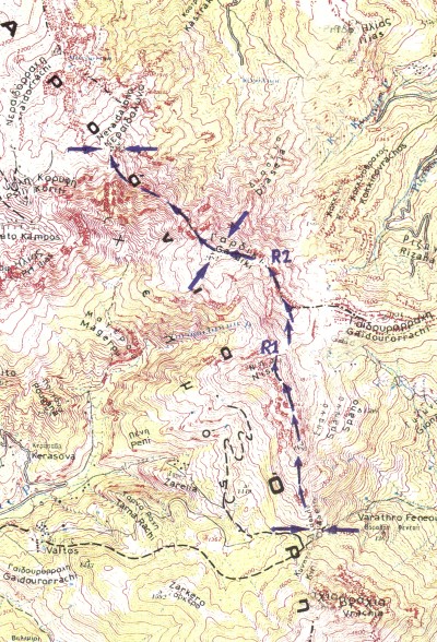 - Στην πρώτη διασταύρωση που συναντάμε στρίβουμε δεξιά και αμέσως αριστερά. Προσπερνάμε ένα μπλε αντλιοστάσιο και μετά από λίγο φτάνουμε την βρύση του Κέρκενα, η οποία τρέχει νερό όλο τον χρόνο και προσφέρει χώρο για διανυκτέρευση. Ο δρόμος συνεχίζει ανηφορικός, προσεγγίζοντας πολύ κοντά το διάσελο και είναι τοπικά κακής ποιότητας. Φτάνουμε όσο ψηλότερα γίνεται για να γλιτώσουμε την υπόλοιπη ανηφόρα μέχρι το διάσελο (1 - 3 ώρες ανάβαση).