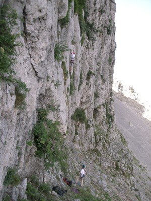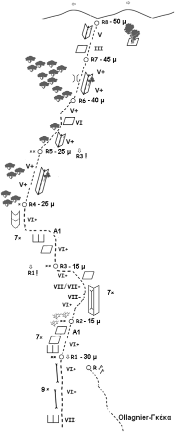 Η 1η σχοινιά αρχίζει με δύσκολη (VII) τεχνική αναρρίχηση σε αρνητική σχισμή και συνεχίζει σε κατακόρυφη σχισμή παλάμης συνεχόμενης δυσκολίας (VI+) μέχρι το ρελέ. Η 2η σχοινιά ακολουθεί πλάκα (VI+), μετά ακολουθεί τεχνητό (A1) και ανόρθωση (V+) σε πατάρι με δέντρα μέχρι το ρελέ. Η 3η σχοινιά ακολουθεί κατακόρυφο δίεδρο (VI+) με αρνητική έξοδο (VII-) και εν συνεχεία πλάκα (VII) ακολουθούμενη από ελαφρώς εκτεθειμένη τραβέρσα μέχρι το ρελέ. Η 4η σχοινιά φεύγει ευθεία επάνω σε αρνητική πλάκα (VI+) και μετά ακολουθεί τεχνητό (Α1). Στη συνέχεια κίνηση σε αριστερή, μακριά τραβέρσα (VI+) ακολουθούμενη από έξοδο (VI+) σε χαρακτηριστικό ανοιχτό λούκι μέχρι το ρελέ, όπου υπάρχει ένα βύσμα για ισοστάθμιση. Η τραβέρσα πρέπει να ασφαλιστεί και για τον δεύτερο με καρύδια και ιμάντες. Η 5η σχοινιά συνεχίζει δεξιά πάνω, σε δίεδρο-ράμπα (V+) μέχρι το ρελέ. Η 6η σχοινιά φεύγει αρχικά λίγο προς τα δεξιά, πάνω σε θάμνους και μπαίνει σε σχισμοδίεδρο (V+) που ανηφορίζει λοξά προς τα δεξιά και καταλήγει σε δεντράκια. Μέσα από τα δεντράκια ξεκινάει σχισμή σε ανασφάλιστη μαύρη πλάκα (VI) την οποία και ακολουθεί. Στο τέλος της σχισμής, τραβερσάρει λίγο δεξιά μέχρι να μπει σε μεγάλο δίεδρο (νεροσυρμή) που κατηφορίζει από την κορυφή. Το ρελέ γίνεται κάπου μέσα στο δίεδρο. Η 7η σχοινιά συνεχίζει σε πολύ όμορφο δίεδρο (V+) που οδηγεί έξω στο φως, σε κεκλιμένο πατάρι με εντυπωσιακή θέα, όπου γίνεται το ρελέ. Η 8η σχοινιά φεύγει ευθεία πάνω (III) και λοξά αριστερά σε πολύ όμορφο δίεδρο (V) χωρίς δέντρα που οδηγεί στην κορυφή για το ρελέ.