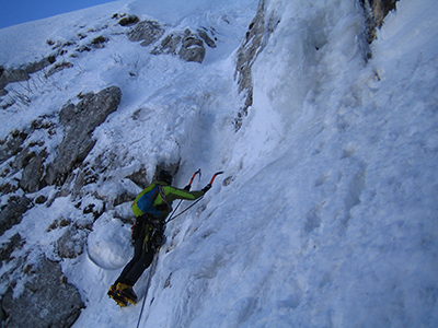 Η 4η σχοινιά (50μ) είναι ένα εύκολο πεδίο χιονιού (55°) και το ρελέ γίνεται στο κέντρο του λουκιού και στη βάση ενός βράχινου τοίχου.