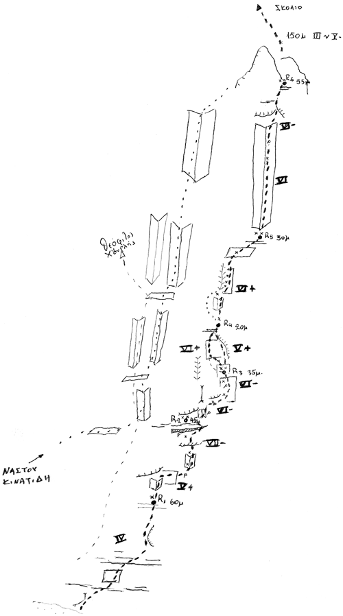 Η γραμμή ξεκινάει δεξιά από την αδημοσίευτη προσπάθεια του Θεόφιλου Μπόσκου, ενώ η 2η σχοινιά, που είναι και η πιο δύσκολη, ακολουθεί παλαιότερη προσπάθεια των Σωτηράκη - Λάμπρη (1988).