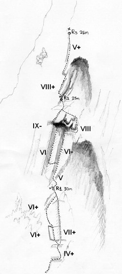 Πρόκειται για ψυχολογική διαδρομή για γερά νεύρα. Η 1η σχοινιά έχει κοινό ξεκίνημα με τον «Καρυοθραύστη» αλλά μετά κινείται σε κόψη με δυναμικές κινήσεις και φτωχή ασφάλιση. Η 2η σχοινιά ακολουθεί ένα χαρακτηριστικό δίεδρο με σχισμή και τραβερσάρει προς τα δεξιά κάτω από τη στέγη, κάνοντας μιαν έξοδο από αυτήν με λίγες ασφάλειες σε σαθρό βράχο.