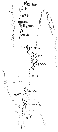 Οι πολλές και συνεχόμενες δύσκολες σχοινιές πάγου με κάποια μικτά σε σαθρό βράχο, την κάνουν να είναι μια σκληρή και σοβαρή διαδρομή.