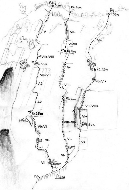 Η 1η σχοινιά έχει κοινό ξεκίνημα με τον «Σκοταδόψυχο» αλλά μετά συνεχίζει σε ράμπα, εύκολη αλλά λίγο σαθρή. Η 2η σχοινιά ακολουθεί μια χαρακτηριστική δυναμική σχισμή, με δυνατότητες για καλή φυσική ασφάλιση. Η 3η σχοινιά αρχικά ακολουθεί μια δύσκολη τραβέρσα αριστερά και μετά σχισμές και δίεδρο. Η 4η σχοινιά αρχικά κινείται σε τοίχο και μετά σε δίεδρο με μέτρια ασφάλιση.