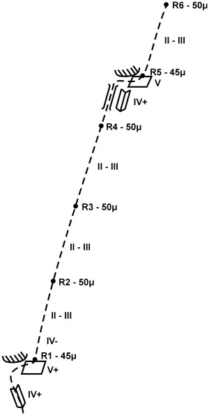 Η διαδρομή ξεκινά από χαρακτηριστικό δίεδρο (IV+), για να συνεχίσει σε πλάκα (V+). Το 1ο ρελέ γίνεται σε πατάρι πίσω από βράχο. Οι επόμενες τρεις σχοινιές κινούνται σε εύκολο πεδίο, μέσα σε μεγάλο ανοιχτό λούκι, με τοπικά περάσματα δυσκολίας II - III. Η 5η σχοινιά ξεκινά με δίεδρο (IV+) που στενεύει και μετά συνεχίζει με τραβέρσα σε πλάκα (V). Ακολουθεί μια εύκολη σχοινιά (II - III) και μετά περπάτημα μέχρι την κορυφογραμμή από την οποία γίνεται και η επιστροφή.