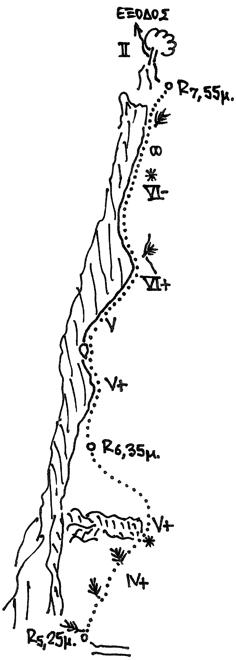 Η διαδρομή «Τέσσερις κόρες και ένας γιος» (VI+, 255μ) ολοκληρώθηκε και σκαρφαλώθηκε στις 7/10/2007 από τους Χρ. Κουνιάκη - Δ. Μπακάλη - Ν. Ντούρο - Δ. Τιτόπουλο.