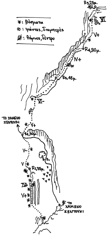 Η γραμμή ξεκινά λίγα μέτρα αριστερά από το «Χαμένο σεντούκι», ακολουθώντας την αριστερότερη από τις τρεις χαρακτηριστικές νεροσυρμές, και διασταυρώνεται μαζί της στο δεύτερο ρελέ. Από το σημείο αυτό συνεχίζει ευθεία στον τοίχο και στη συνέχεια ακολουθεί τη χαρακτηριστική γραμμή (βαθιά σχισμή) λοξά προς τα δεξιά.