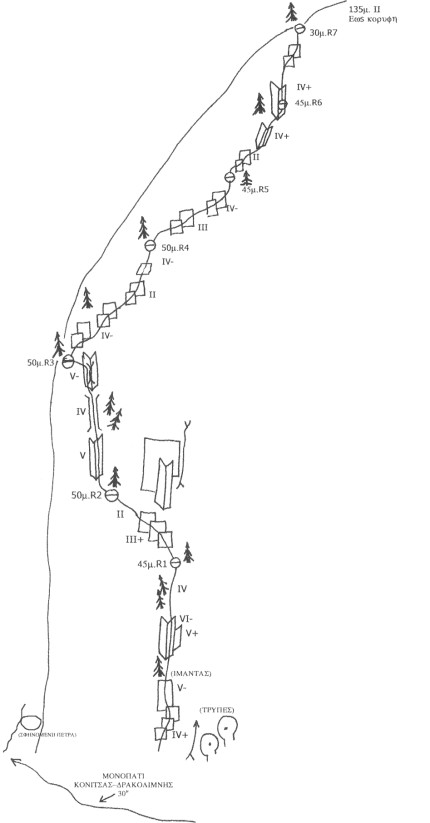 Η διαδρομή «Της καλύβας» (VI-, 450μ) ανοίχτηκε στις 16/9/2000 από τους Γ. Σταθόπουλο - Γ. Μελά σε 5 ώρες.