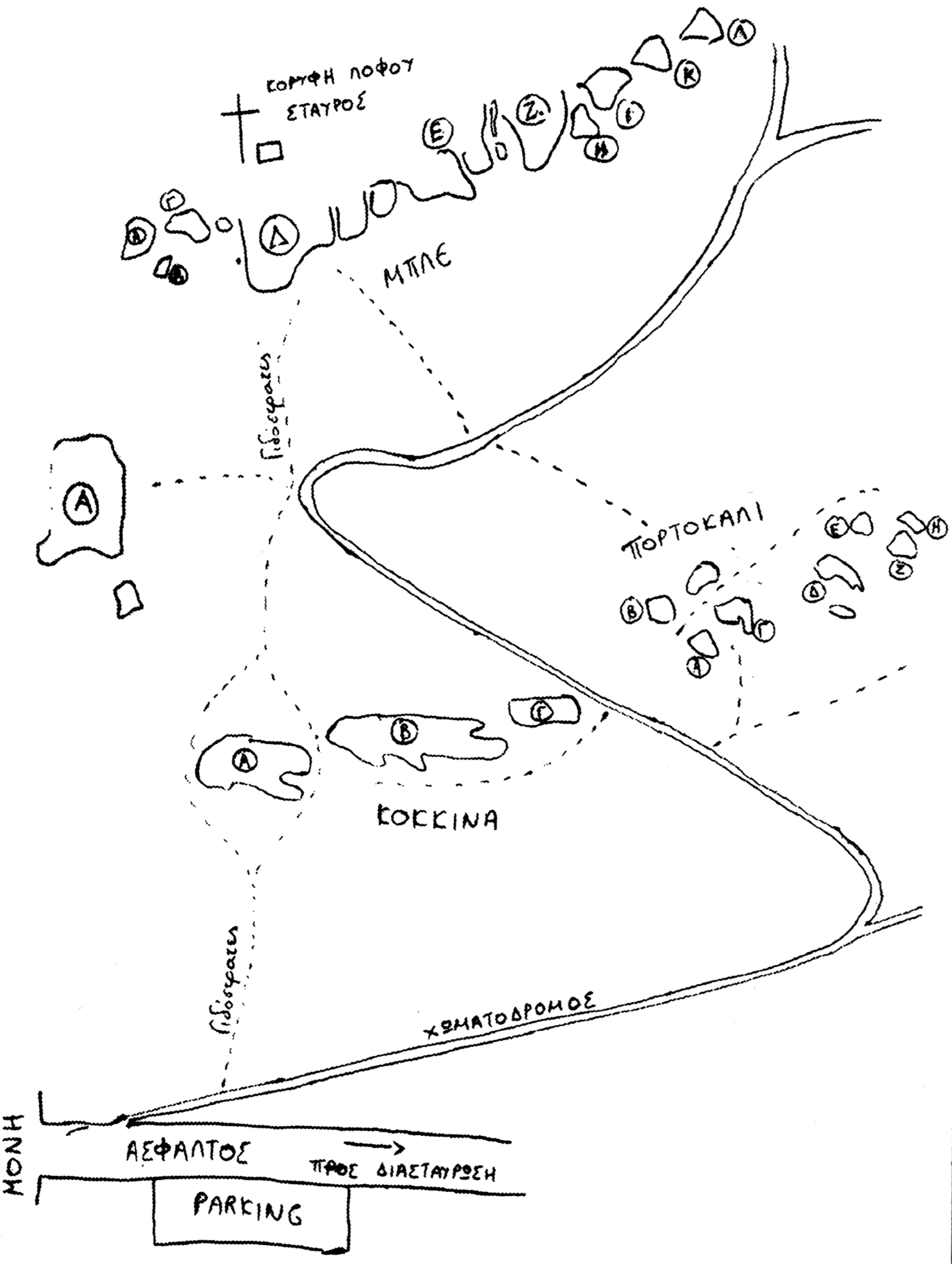 To access, we initially take the road that goes up to the summit of Penteli and when we meet the intersection for the Monastery of Agios Panteleimonas, we turn left and in 800m the road ends at the entrance of the monastery. Approximately 30m before the entrance, on our right, a dirt road leaves, which in 600m leads to the first two sections, the Red on the left of the road and the Orange on the right. If we continue for 200m, we reach a right turn, where we leave the road and follow goat tracks towards the top of the ridge, below which the Blue section is located. Almost at the top of the ridge there is a large iron cross and a large antenna. We can also reach this point from Dionysos with a tiring 45min hike, initially following the dirt road to Aloula, passing the climbing sectors of the first and second square and finally hiking a path to the ridge. The choice of Dionysos for access only makes sense if we want to climb first in its own sectors and then to Agios Panteleimonas.