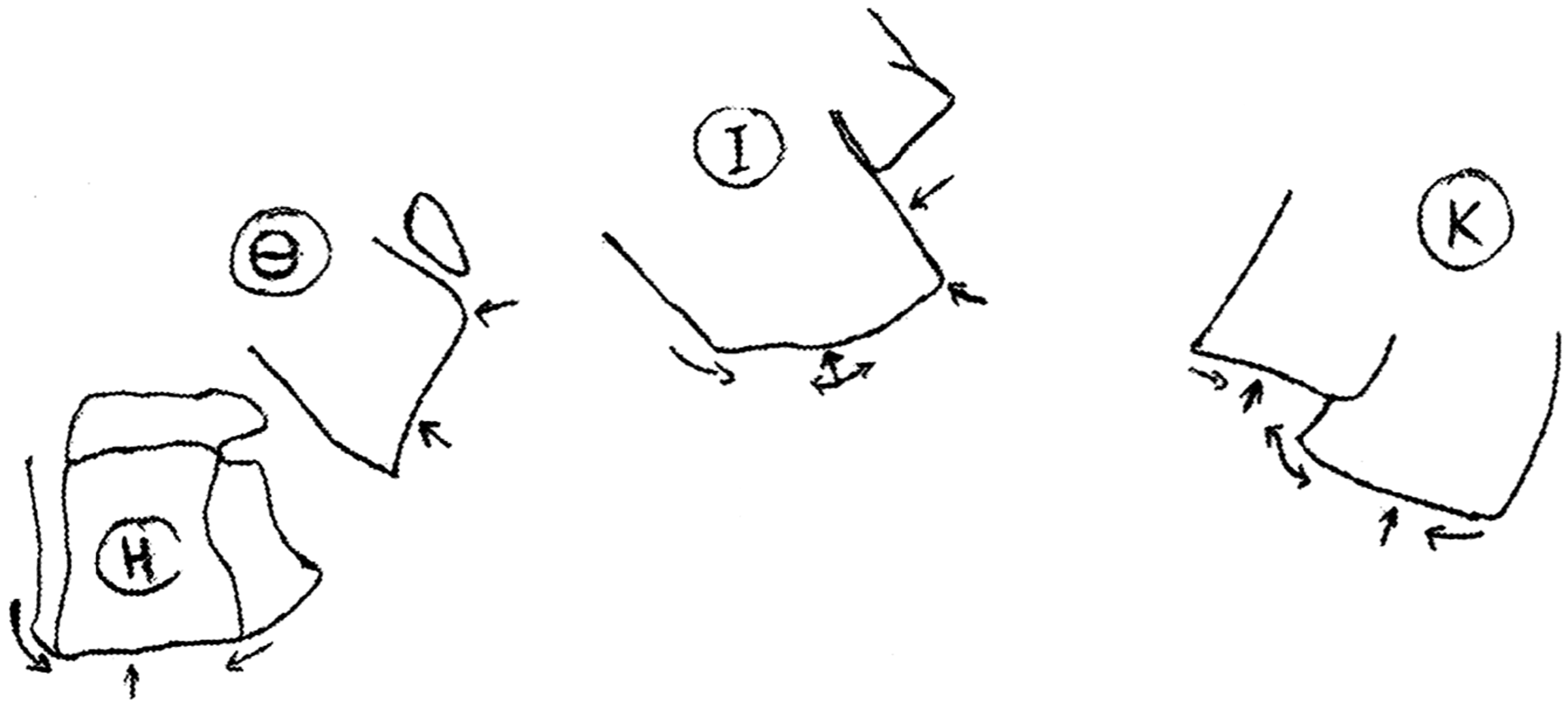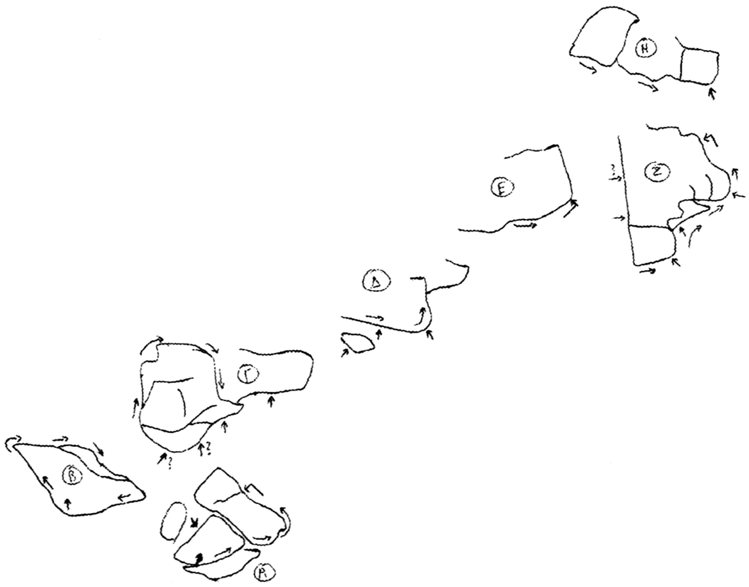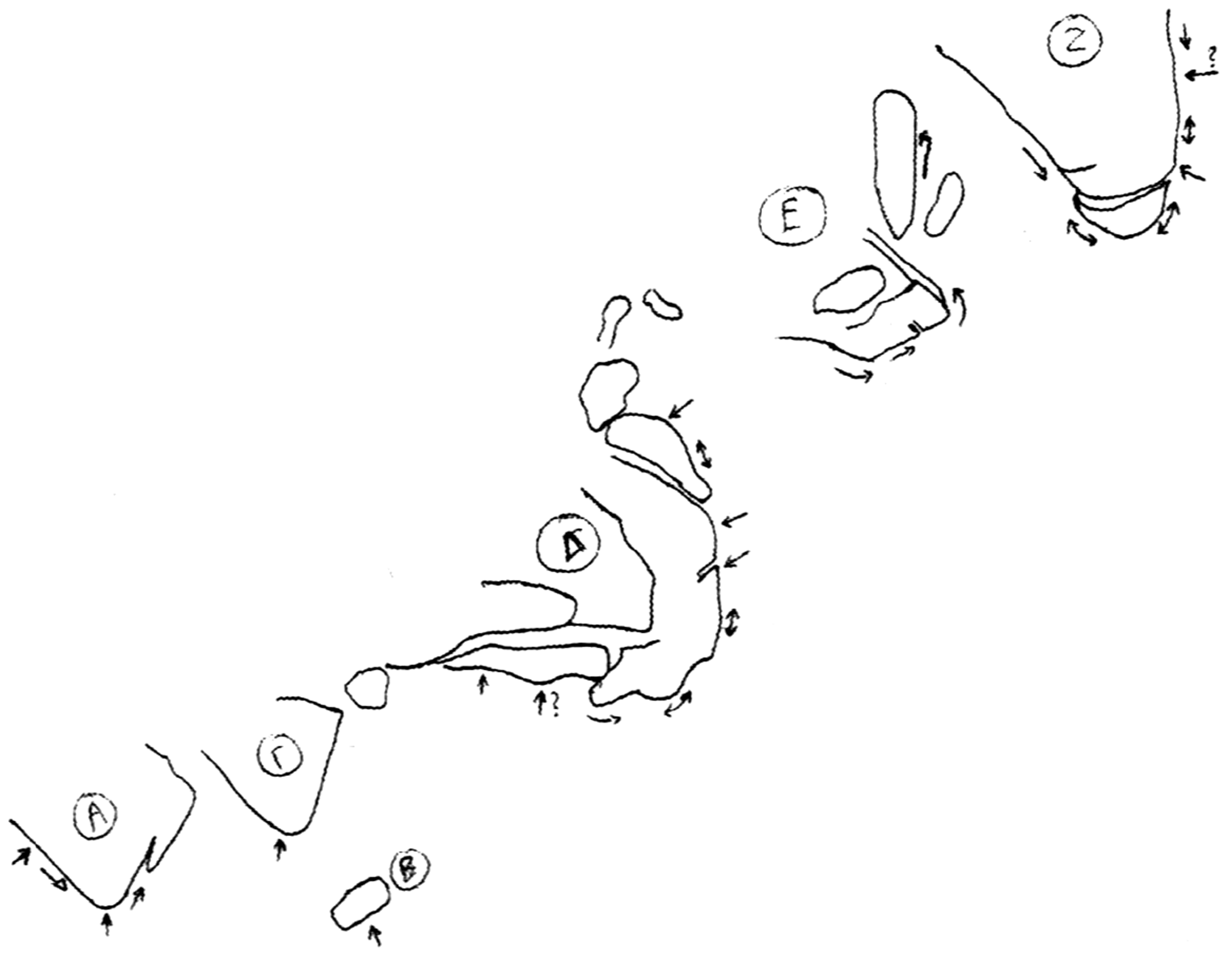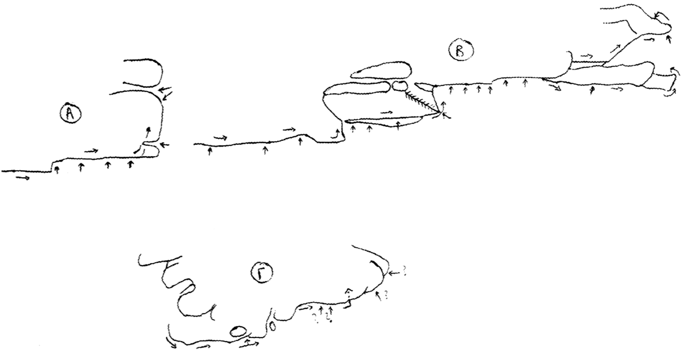 On all three sections, the passages that have not yet been done are marked with a "?", while the symbol "X" on the rocks means that we do not step or do not grab there.