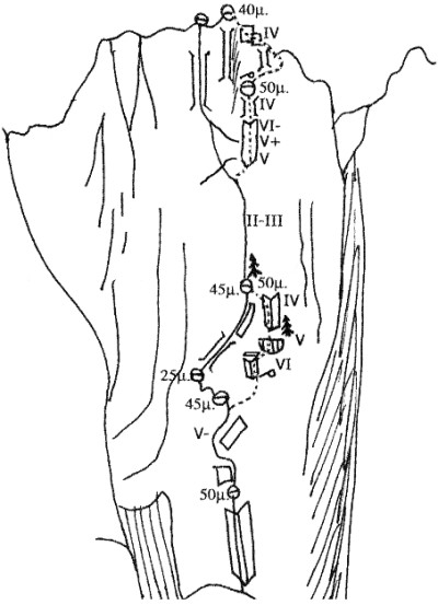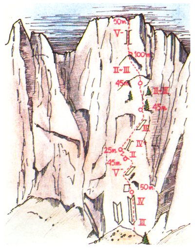 A variation of the route consisting of 3 pitches (VI, 140m) was realized by mistake on 2004 by G. Stathopoulos - G. Melas - H. Pappas. This variation starts from R2 of the main route and moves to the right on an overhanging dihedral (VI) where there is a piton, then a traverse (V) follows above the overhang, where the abovementioned little tree is found, and after that, the line goes into a dihedral (IV), until the big tree. At that point the belay, which is common to R4 of the main route, is set. From that point on, the line enters in the main route, following its easy parts (II - III). At the final wall, the line separates again from the main in order to move to the right, following the crack-dihedral that leads to the higher point of that wall. It begins on a crack-dihedral (V+), then it follows a slab with a fissure (VI-), and after that a chimney, where there is a thread with a sling (IV). The belay is set on a spike with a piton. The last pitch moves to the right, in a gully, which then becomes a chimney (IV+) and finally through an easy climbing field that leads to the top.