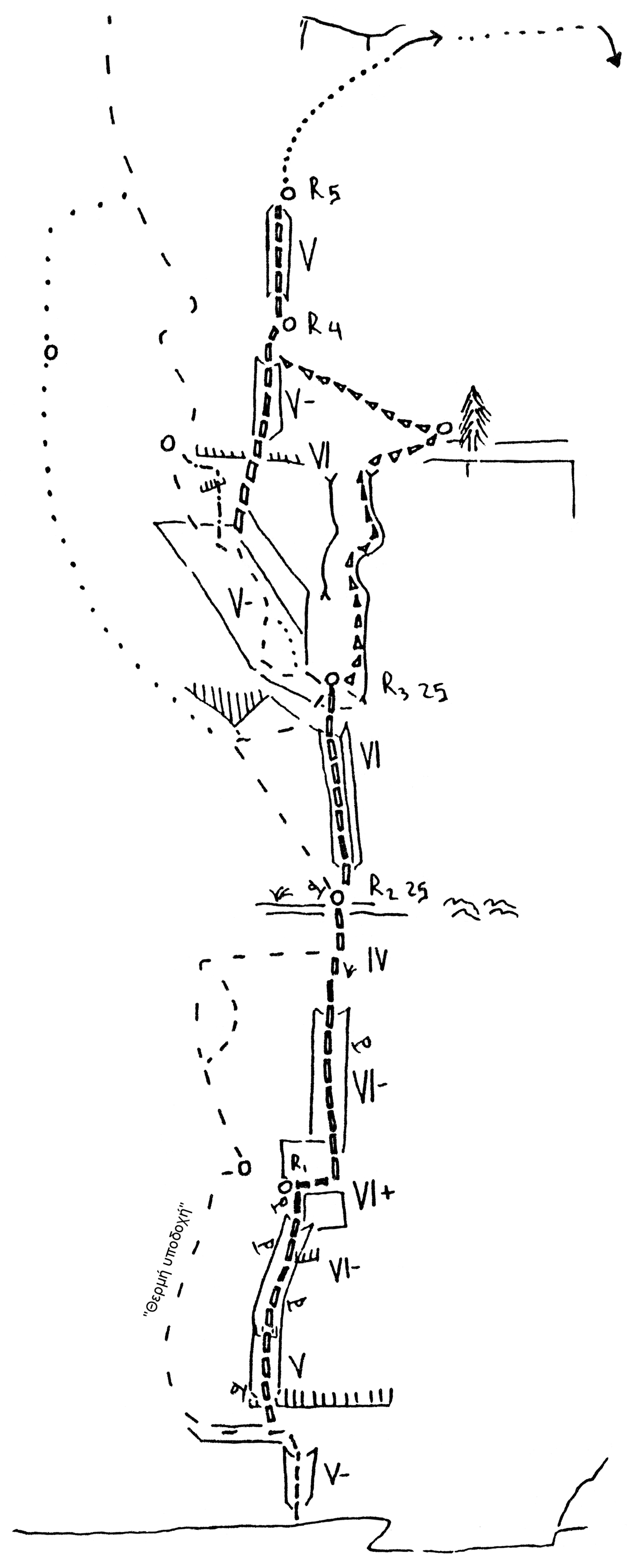 The first ascent of the route "Apli methodos ton trion" (VI+, 150m) was realized on the 17/8/1991 by G. Kitantzidis - K. Tsoukleidis - M. Tsoupras.