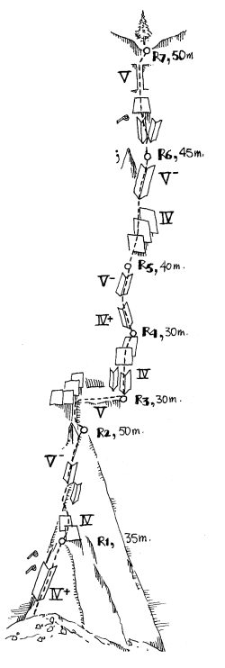 The exact starting point of the line is the col, at the base of the crag. Following a characteristic loose dihedral for two pitches, the route gets to the summit of the characteristic tower, where a big rope sling is found. The 3rd pitch is a traverse to the right (V, 2 pitons). The 4th pitch follows the dihedral to the right and then continues moving almost direct for 200m until the ledge. From that point up, until the summit, just follow the easiest way on the ridge.