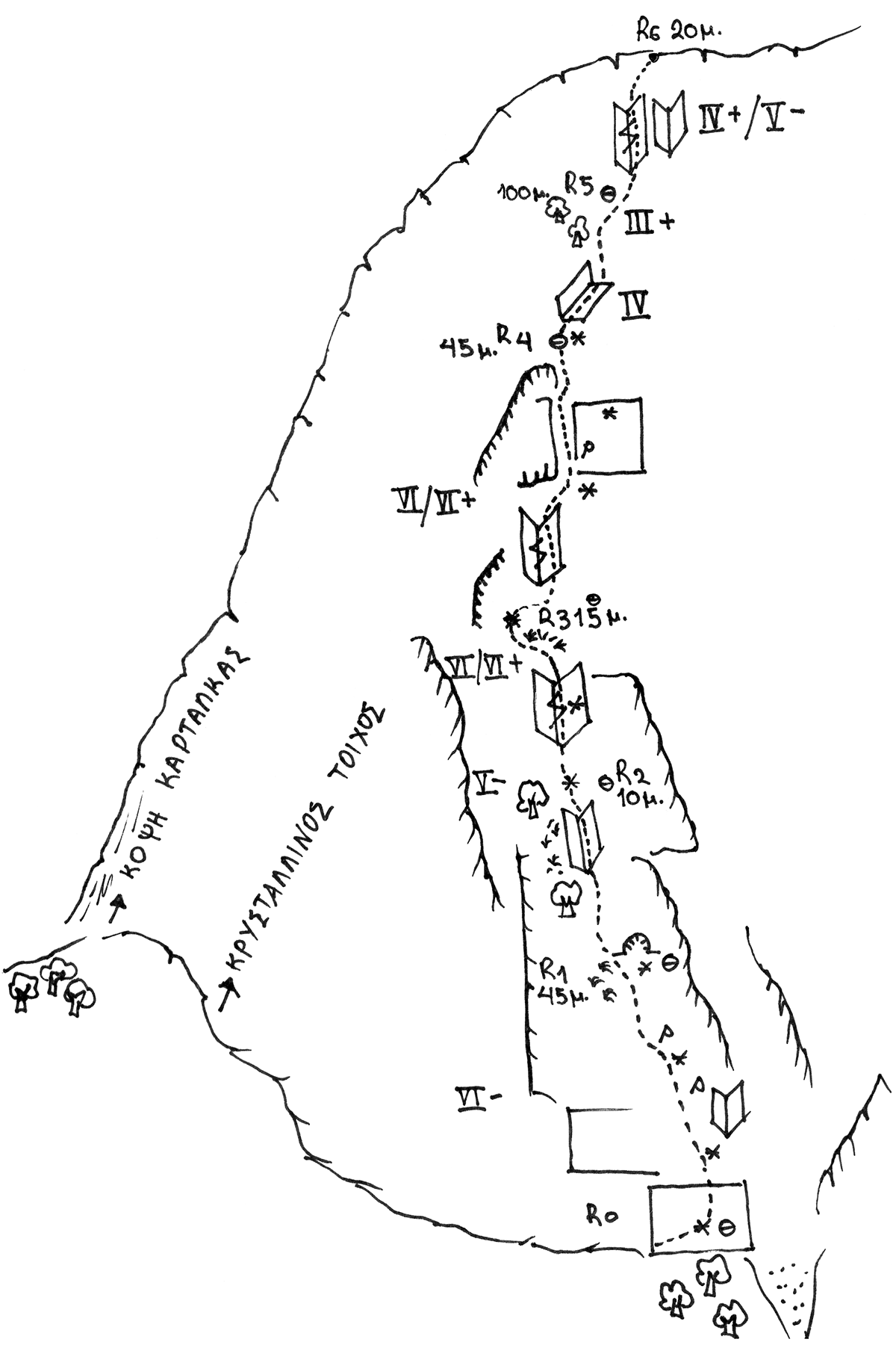 The first ascent of the route “Dihedrals of the snails” (VI+, 235m) was realized on 6/7/2003 by Th. Chatzisyrlis - G. Kolonis.
