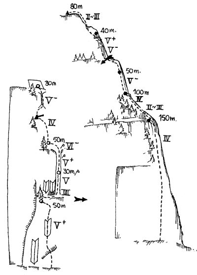 The first ascent of the route "Dromos tou Iliou" (V+, 650m) was realized on 1/9/1998 by V. Galanis - Ch. Haldogeridou and it moves on the ridge, left to the route "Houni tis perdikas".
