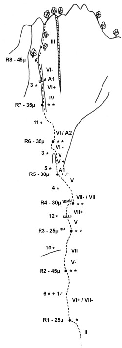 E. Moshovits - K. Tsouklidis were the first to repeat the route, rating it at VII+ A0. In particular, the rating that they suggest for this route is VII+ A0 instead of A1 at the 6th pitch, VII instead of A2 at the 7th pitch and VI+ instead of A1 at the 8th pitch.