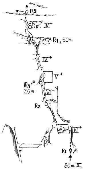 The first ascent of the route "Kallou - Tzovara" (VI, 300m) was realized on 14/9/1997 by D. Kallos - K. Tzovaras.